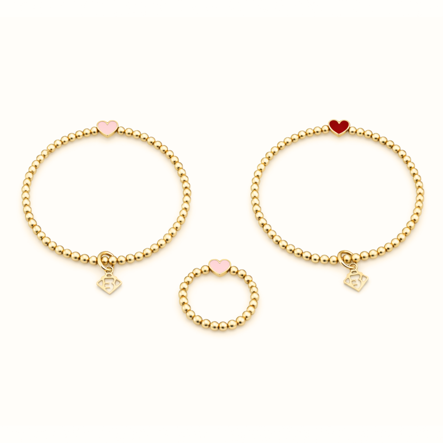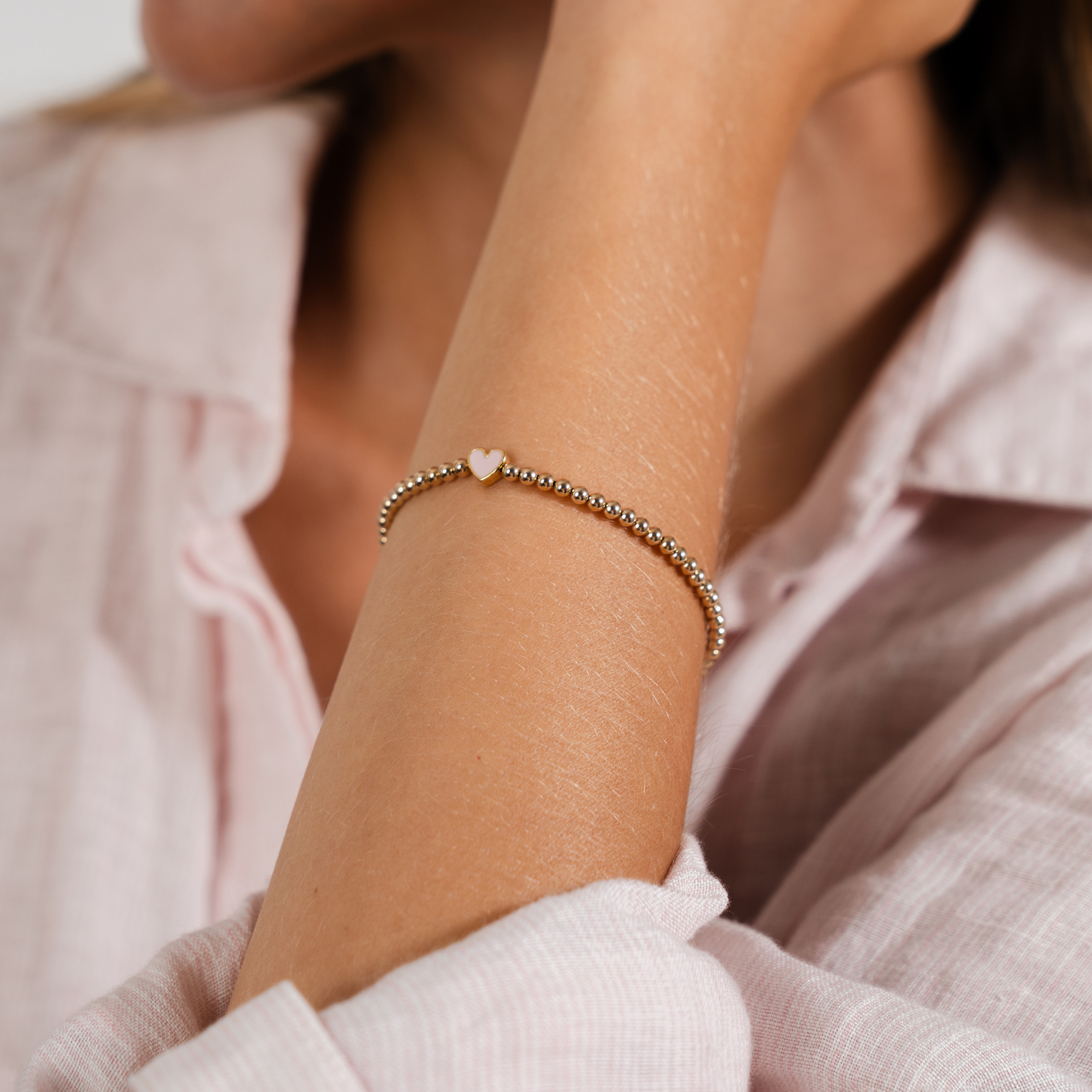 Soft, romantic, and full of warmth, the Blush Happy Heart Bracelet is designed to celebrate love in its sweetest form. Handcrafted with radiant 3mm gold-filled beads and finished with a beautifully crafted pink blush enamel heart, this piece adds a delicate pop of color and meaning to any stack. Effortless to wear and easy to gift, it’s a timeless reminder that joy lives in the little moments.