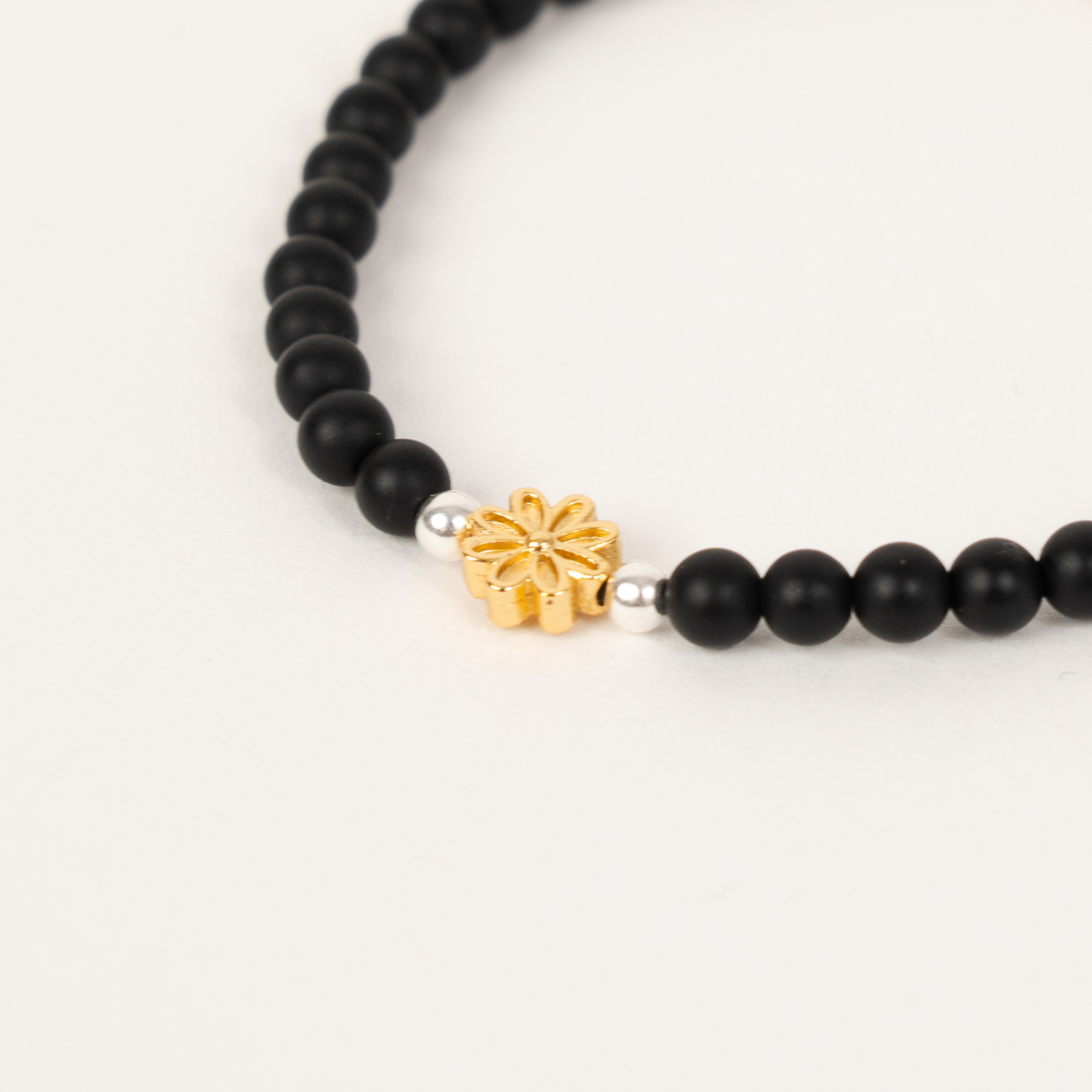 - Matte Black: 4mm matte black beads, 3mm silver accents, 1 golden mini flower, signature ER charm