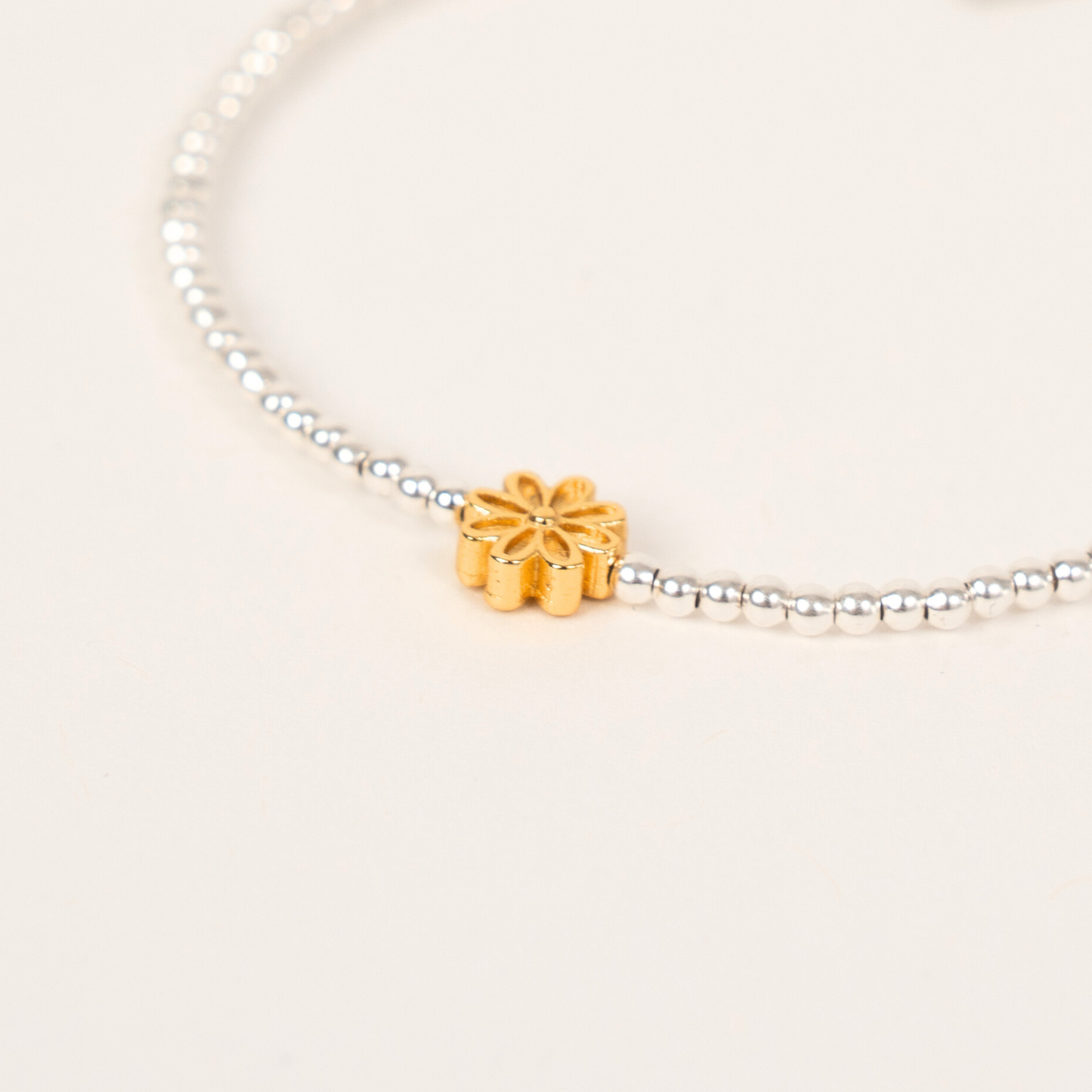 - Two Tone: 2mm mixed gold & silver beads, 1 golden mini flower, signature ER charm